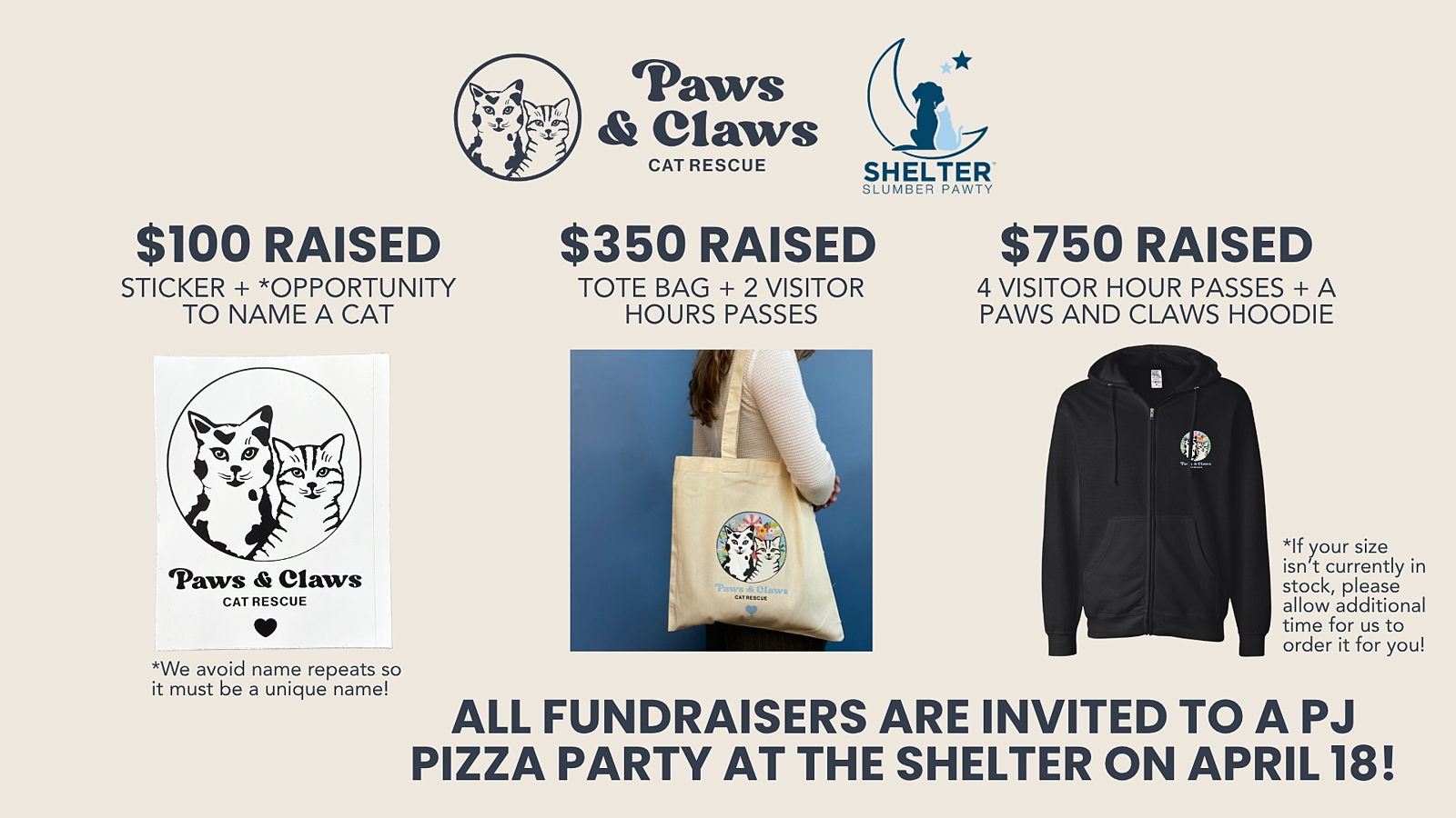 As a thank you, all fundraisers will be invited to a special PJ pizza party at the shelter that evening—and yes, there will be prizes, too!