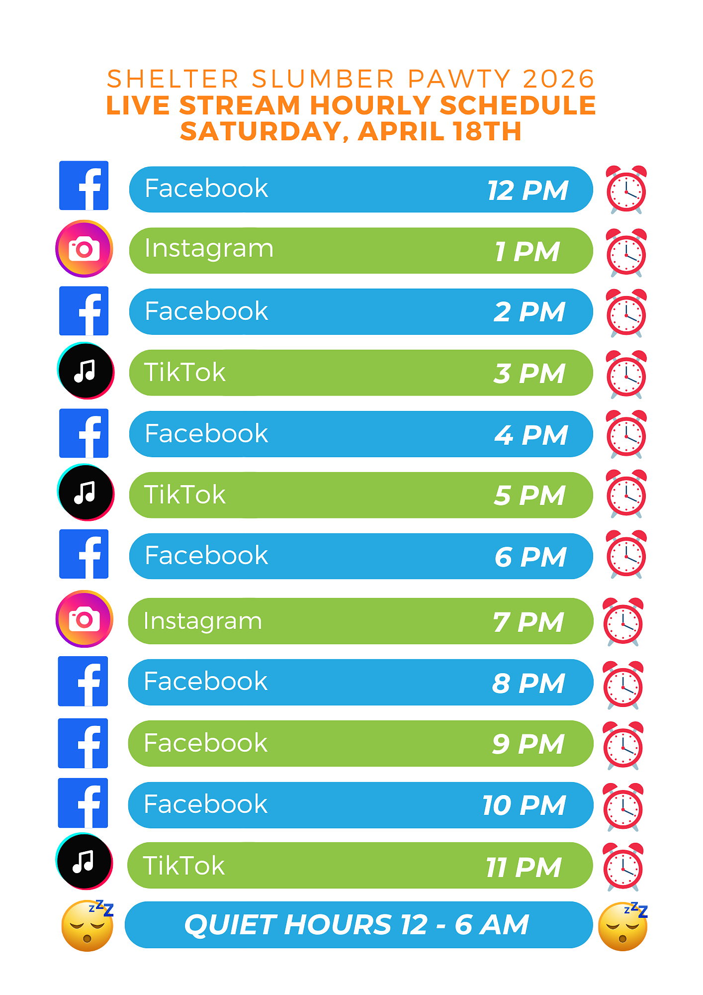 On April 18th, don't forget to tune into our Facebook, Instagram and TikTok livestreams throughout the day (Schedule below) and join the pawty with us!