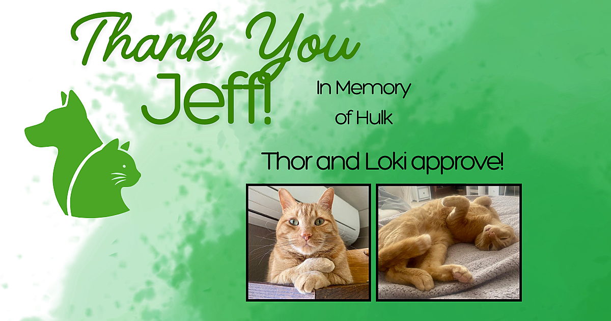 Thanks to Jeff for the donation made at The Cat Hut in memory of Hulk! the loving gift you've given will live on in others we've rescued! 💚